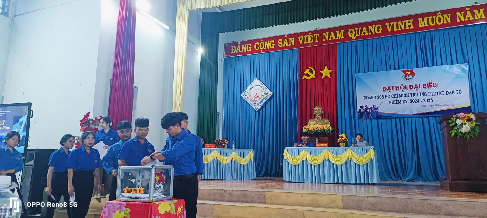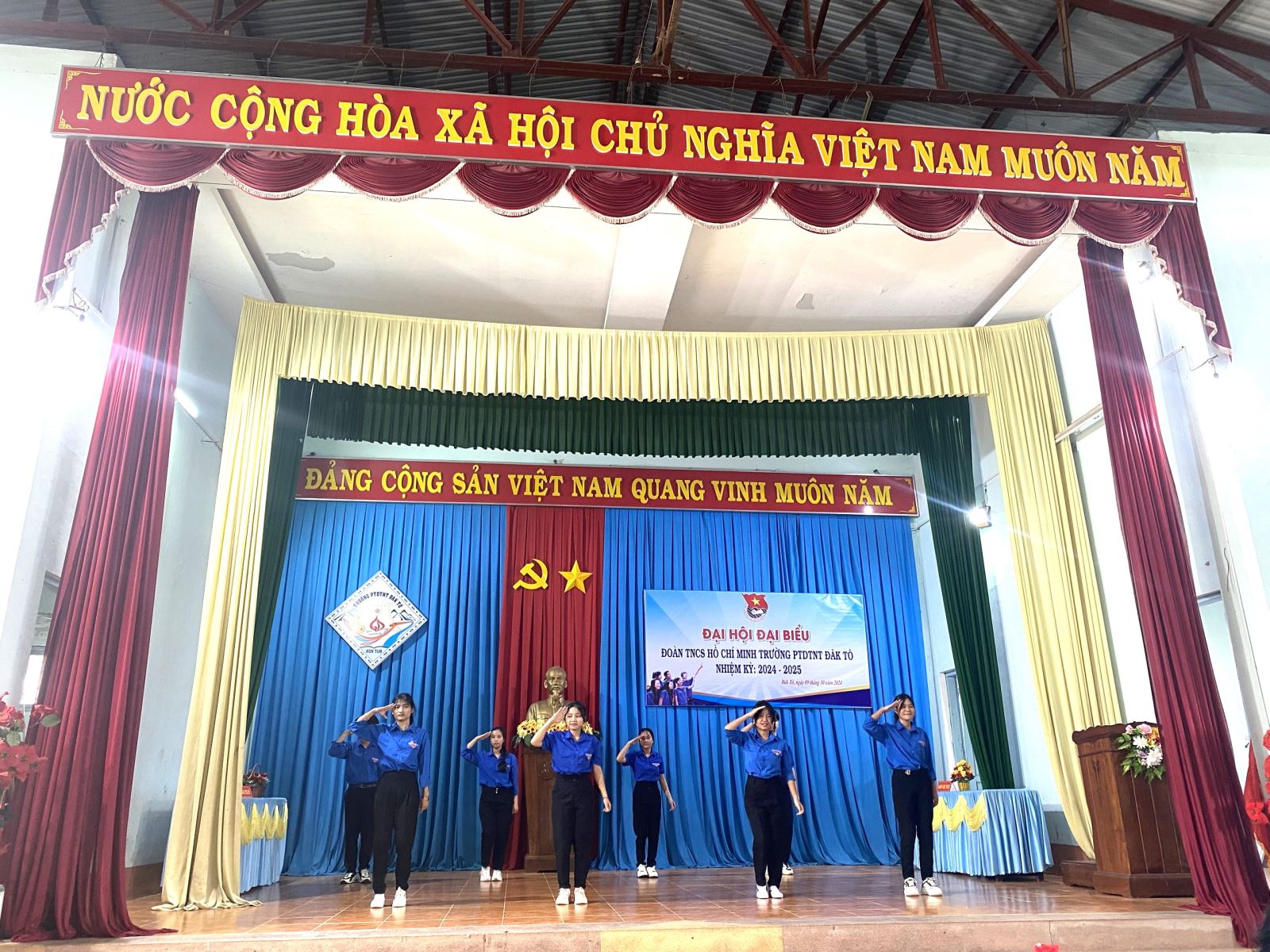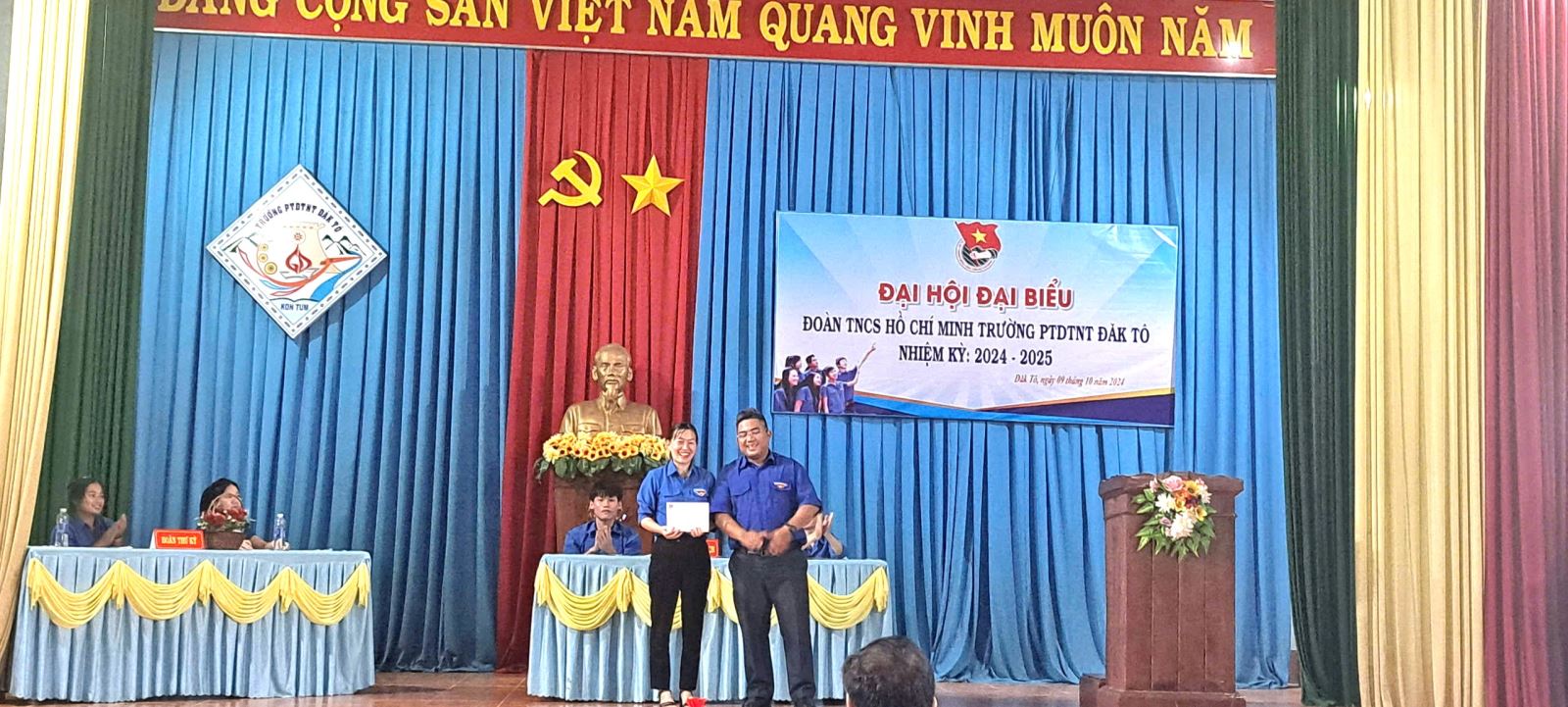 Được sự thống nhất của BTV Huyện đoàn Đăk Tô và Chi bộ Đảng nhà trường,chiều ngày 09/10/2024, đã diễn ra phiên chính thức Đại hội đại biểu TNCS Hồ Chí Minh trường PTDTNT Đăk Tô nhiệm kì 2024-2025 nhằm đánh giá kết quả hoạt động trong nhiệm kỳ vừa qua, trên cơ sở đó đề ra phương hướng nhiệm vụ trong nhiệm kỳ tới và bầu ra một Ban Chấp hành mới có đủ năng lực, phẩm chất để điều hành, lãnh đạo và chỉ đạo công tác Đoàn và phong trào thanh niên trong nhà trường.