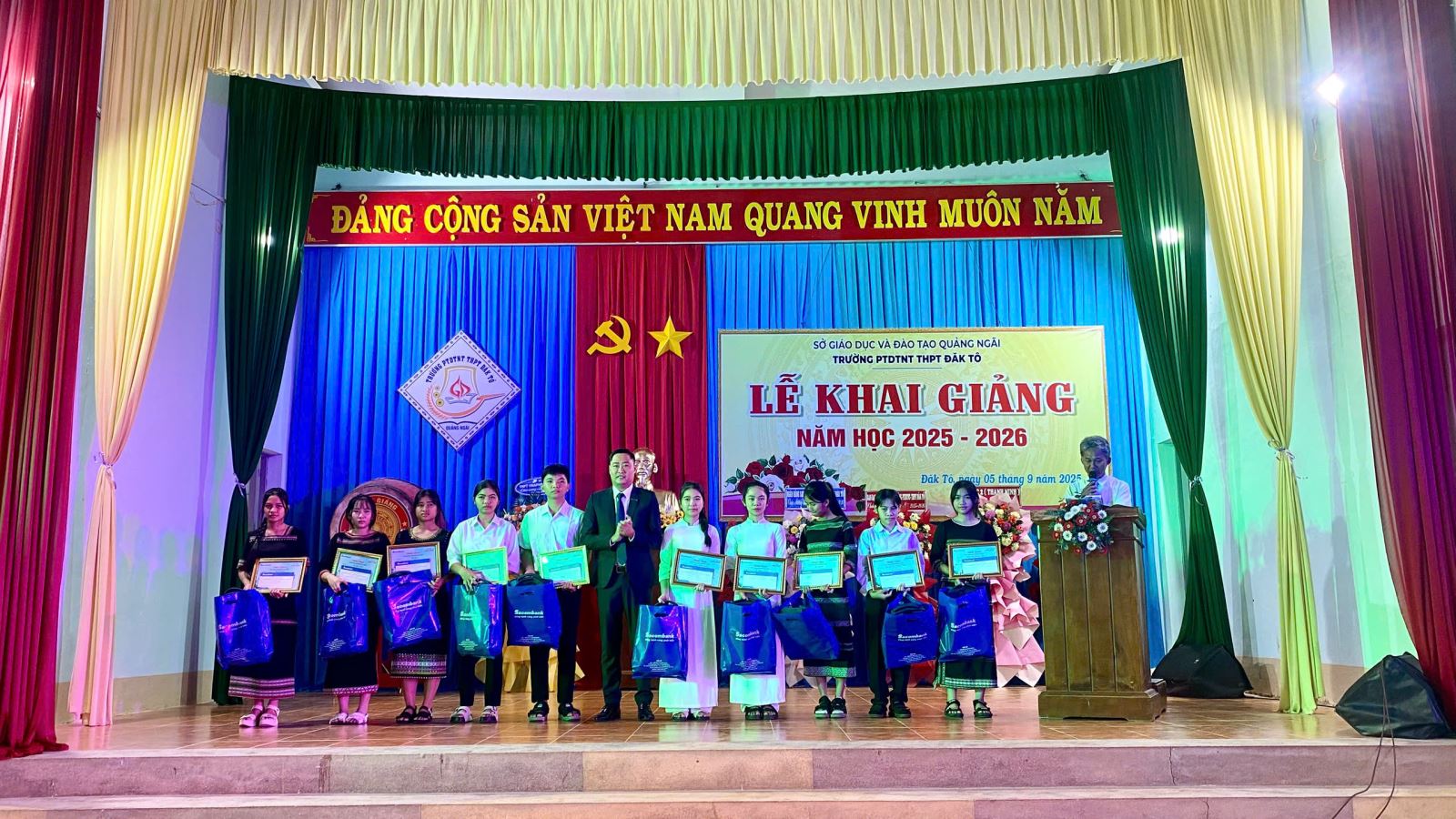 Nhận dịp lễ khai giảng, ngân hàng Sacombank – chi nhánh Đăk Tô đã trao 10 suất học bổng cho học sinh có hoàn cảnh khó khăn vươn lên học tốt.